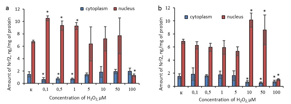 Fig. 3. The amount of nuclear factor erythroid E2-related factor 2 (Nrf2) in the cytoplasm and nucleus of cells of Caco-2 line in vitro on exposure to hydrogen peroxide at concentrations of 0.1–100 µM within 24 (a) and 72 hours (b). Note: c — control; * — statistically significant differences from control, р < 0.05 (Newman-Keuls test).