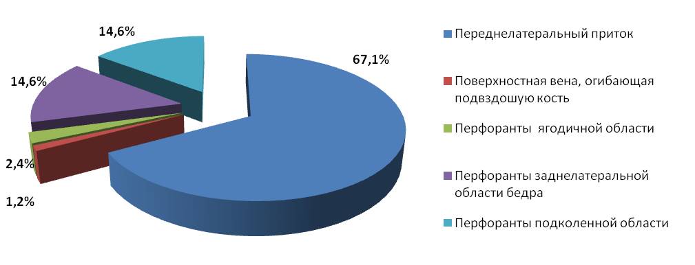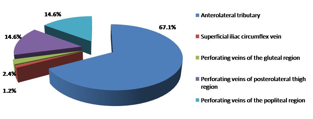 Lesion of large tributaries of the main subcutaneous veins is prevalent in atypical forms of varicose veins — 68.3% (n = 56). Of these: varicose transformation of the anterolateral tributary made 98.2% (n = 55); varicose transformation through the superficial iliac circumflex vein — 1.8% (n = 1).