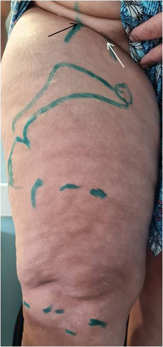 Notes: a black arrow — a varicose anterolateral tributary, a white arrow — the great saphenous vein orifice.