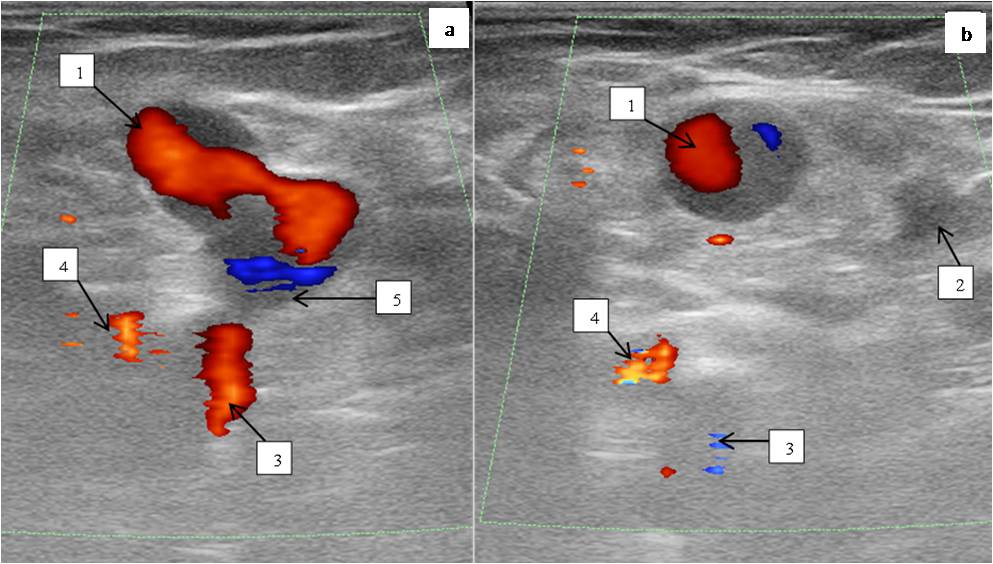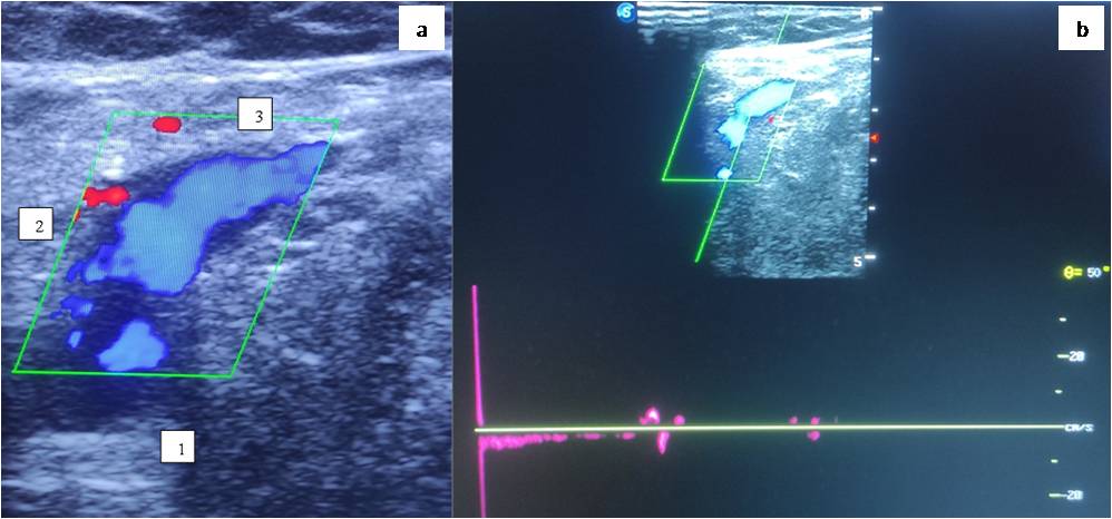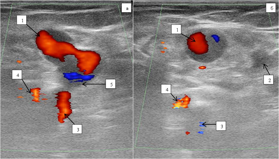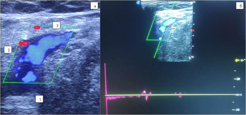 Fig. 4. Female patient Z., 35 years old. Control ultrasound scan of the vessels of saphenofemoral junction region in two years after the surgical intervention: a — color Doppler imaging mode; b — spectral Doppler mode.