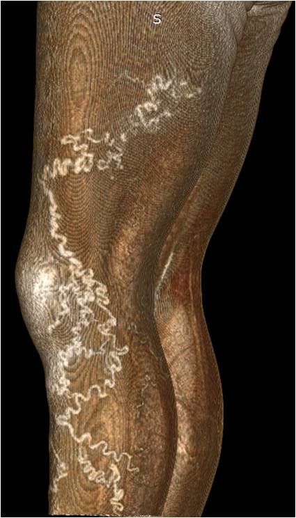 Fig. 6. Patient A., 45 years old. Computer phlebogram, 3-D reconstruction mode. Varicose saphenous veins along the posterolateral surface of the thigh and lateral surface of the shin