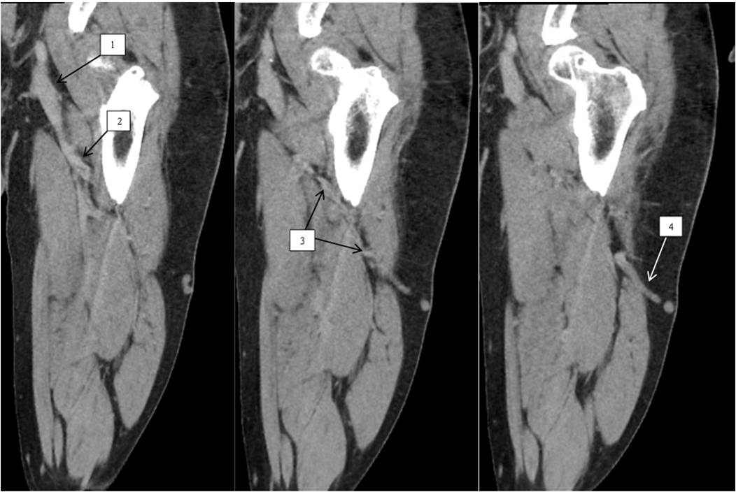 CT-phlebography: deep and superficial veins uniformly, homogenously contrasted along the entire length. Along the posterolateral thigh surface, varicose transformation of saphenous veins associated through the PV with the deep femoral vein (Figures 6, 7).