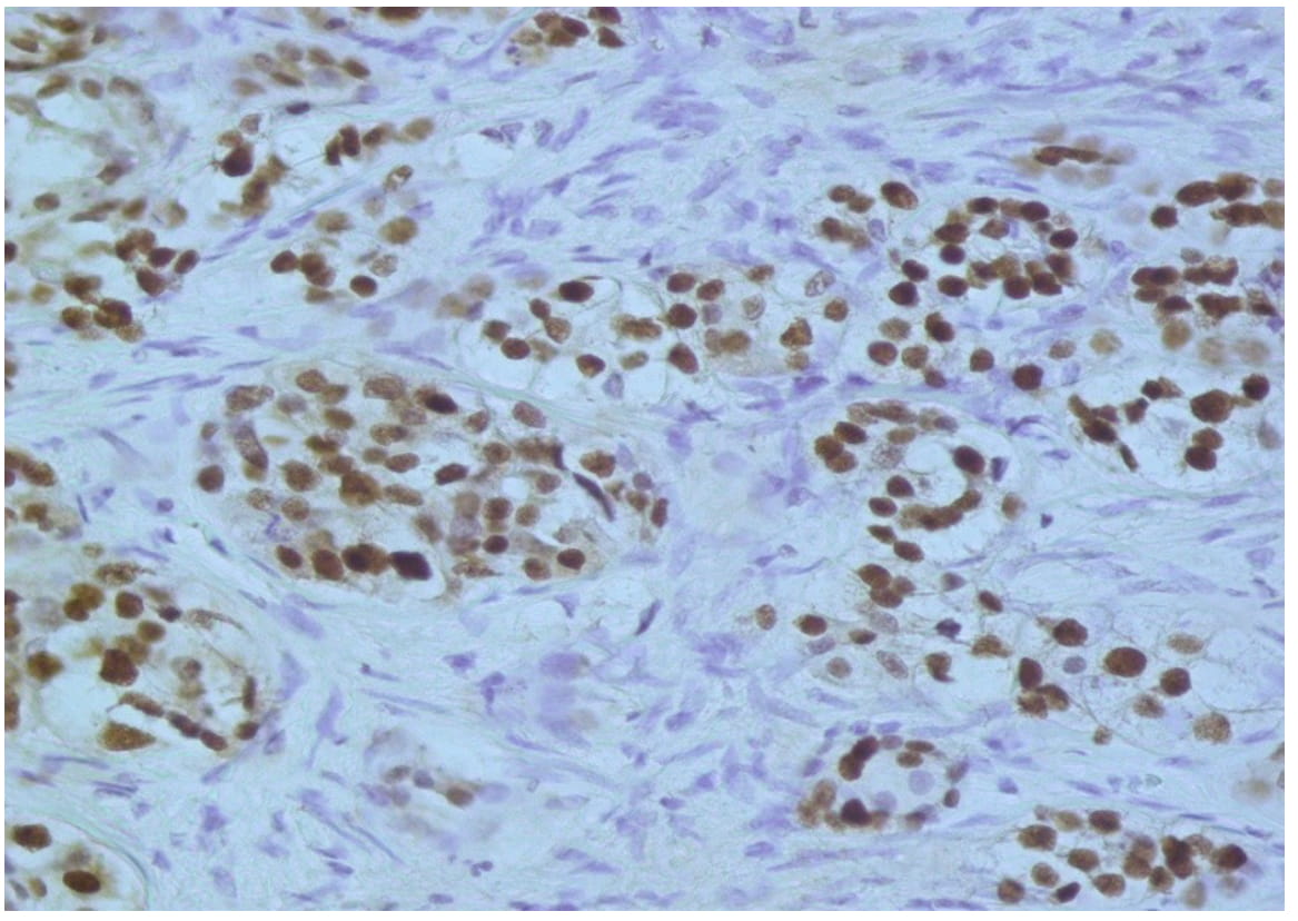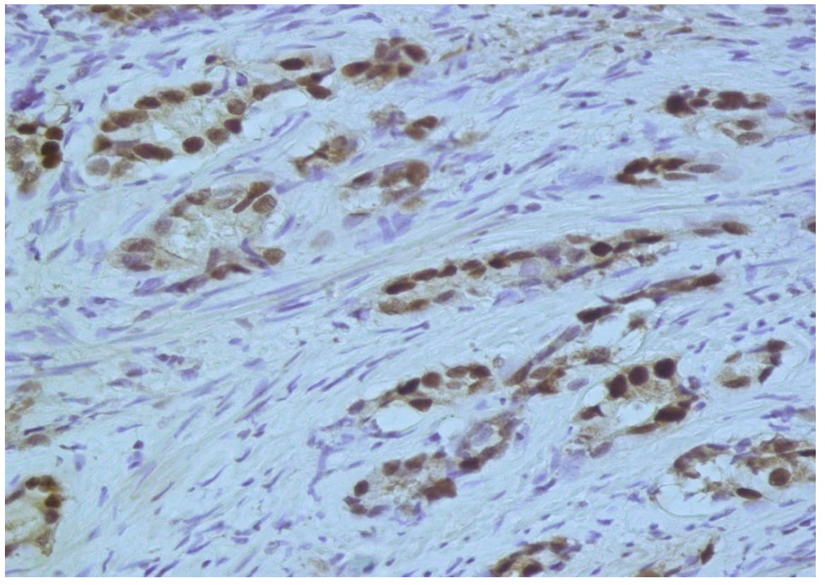 Fig. 3. Evident nuclear expression of ERG in cells of acinaradenocarcinoma of prostate. Immunohistochemical reaction, x400