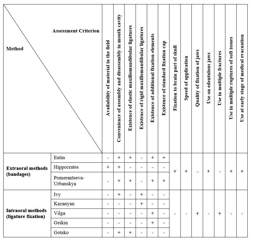 It was also found that Ivy’s method of maxillomandibular ligature fixation possesses the most of advantages: simplicity of structure and convenience of use, high-quality and reliable fixation of jaw fragments, absence of additional fixation elements characteristic of Vilga’s and Geikin’s methods. Method of Gotsko is difficult in implementation which is a considerable drawback. All intraoral methods are characterized by bad accessibility in the field which considerably limits their application.