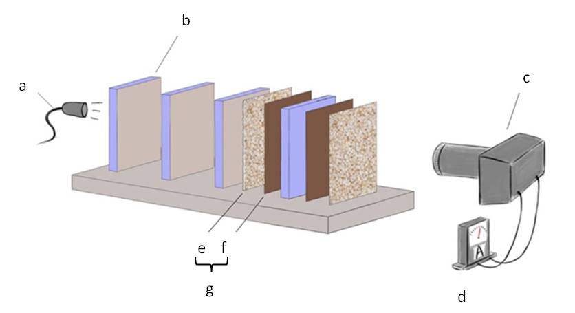 Fig. 1. Experimental set-up: light source (a); one of four glass plates imitating front teeth (b); photocell (c) connected with ammeter (d); oatmeal decoction (e); a film (f) of black tea imitating tooth plaque (g).