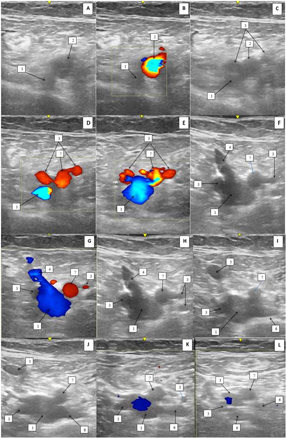Fig. 1. US duplex scan of the vessels of the upper third of thigh on the left of patient K. (two-dimensional, gray scale mode (B-mode) and color Doppler imaging mode; cross-section)): (А–E) superiorly the saphenofemoral junction; (F–H) the level of saphenofemoral junction; (I–L) — inferiorly the saphenofemoral junction.