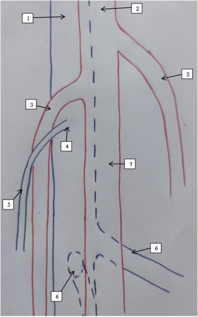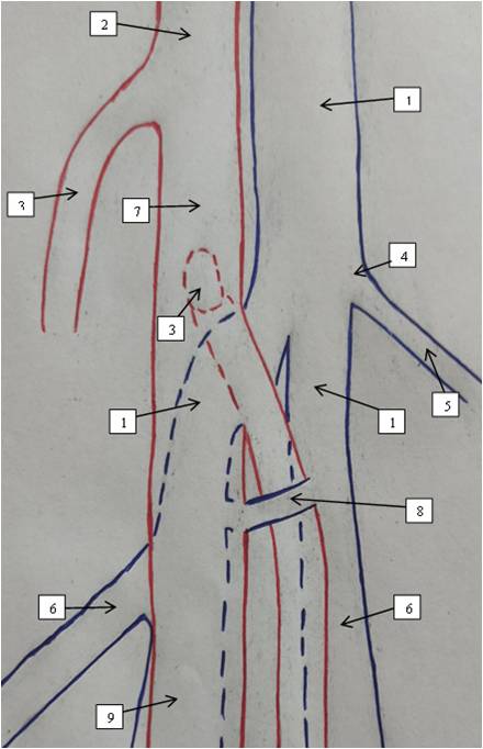 Fig. 4. A scheme of variant anatomy of vessels of the upper third of thigh on the right of patient K.