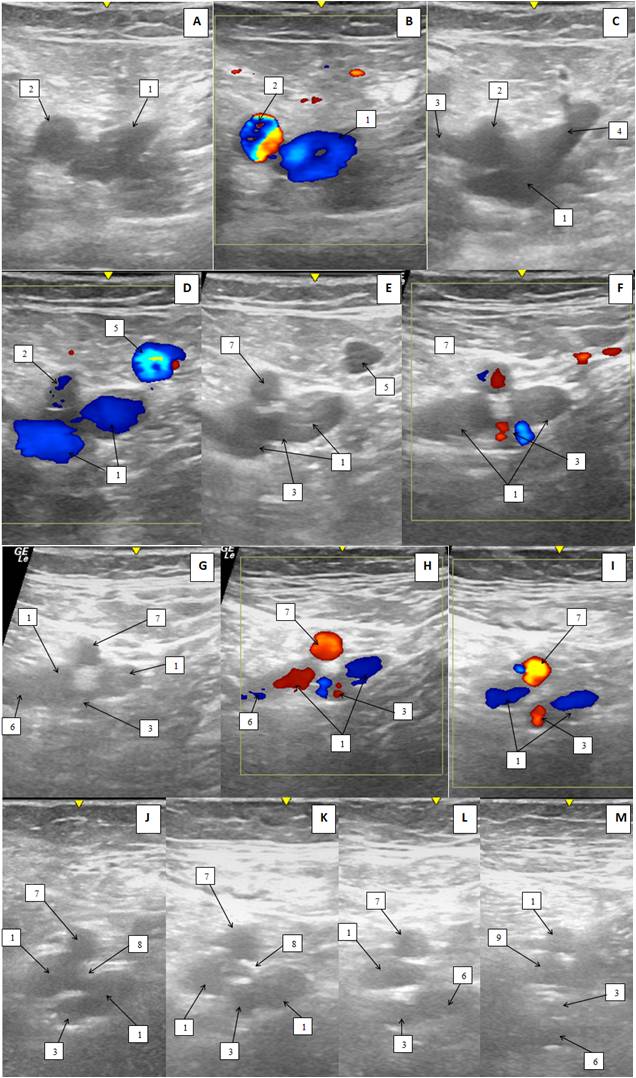 Fig. 3. US duplex scan of the vessels of the upper third of thigh on the right of patient K. (two-dimensional, gray scale mode (B-mode) and color Doppler imaging mode; cross-section)): (А–B) superiorly the saphenofemoral junction; (C) the level of saphenofemoral junction; (D–M) inferiorly the saphenofemoral junction.