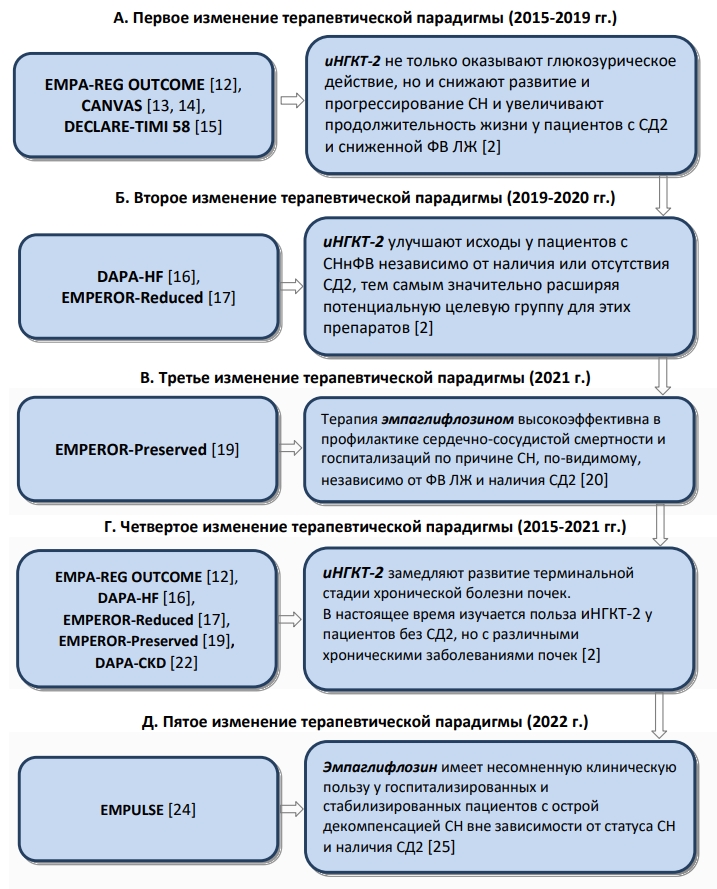 Введение. Несмотря на усилия кардиологических сообществ по внедрению подходов к лечению сердечной недостаточности (СН), основанных на доказательствах высшего уровня, СН остается одной из самых «больших неудовлетворенных потребностей в терапии сердечно-сосудистых заболеваний» по причине широкой распространенности, неблагоприятного прогноза и недостаточного применения методов лечения с клинически доказанной эффективностью. В статье рассматривается хронология изучения и внедрения в клиническую практику ингибиторов натрий-глюкозного котранспортера (син.: глифлозинов) 2-го типа (иНГКТ-2) с момента создания первого препарата группы ― флоризина ― и далее, поэтапно по мере смены терапевтической парадигмы как результата проведенных клинических исследований. Так, исследования EMPA-REG OUTCOME, CANVAS, DECLARE-TIMI 58 продемонстрировали, что иНГКТ-2 не только оказывают глюкозурическое действие, но также снижают развитие и прогрессирование СН и увеличивают продолжительность жизни пациентов с сахарным диабетом 2-го типа (СД2) и сниженной фракцией выброса (ФВ) левого желудочка (ЛЖ). Исследования DAPA-HF, EMPEROR-Reduced доказали возможность улучшения исходов у пациентов с СН со сниженной ФВ ЛЖ независимо от наличия или отсутствия СД2, тем самым значительно расширив потенциальную целевую группу для иНГКТ-2. Исследование EMPEROR-Preserved ― единственное исследование иНГКТ-2 на сегодняшний день (исследуемый препарат ― эмпаглифлозин), продемонстрировавшее высокую эффективность в профилактике сердечно-сосудистой смертности и госпитализаций по причине СН, по-видимому, независимо от ФВ ЛЖ и наличия СД2. В результате, 9 сентября 2021 г. FDA (Food and Drug Administration, США) присвоило препарату Jardiance® (эмпаглифлозин) статус «прорывной терапии» (англ.: «breakthrough therapy») для лечения СН с сохраненной ФВ ЛЖ. Исследования EMPA-REG OUTCOME, DAPA-HF, EMPEROR-Reduced, EMPEROR-Preserved, DAPA-CKD показали, что иНГКТ-2 замедляют развитие терминальной стадии хронической болезни почек. Наконец, основным результатом исследования EMPULSE, завершившегося в 2022 г., стала доказанная клиническая польза эмпаглифлозина у госпитализированных и стабилизированных пациентов с острой декомпенсацией СН вне зависимости от статуса СН и наличия СД2.