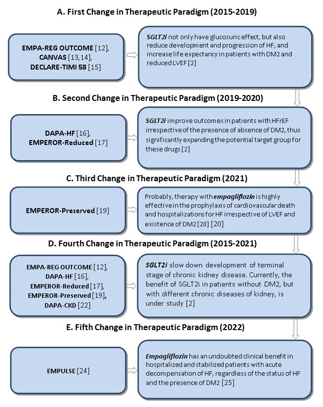 INTRODUCTION: Despite the efforts of the cardiologic communities to introduce approaches to treatment of heart failure (HF) based on the highest level of evidence, HF remains one of the “least satisfied demands in the therapy of cardiovascular diseases” due to high prevalence, poor prognosis and insufficient use of treatment methods with clinically proven effectiveness. The article considers chronology of study and introduction of sodium-glucose cotransporter 2 inhibitors (syn.: gliflozins; SGLT2is) in clinical practice from the moment of creation of the first drug of this group ― florizin ― and further, stepwise with the change of the therapeutic paradigm as the result of performed clinical trials. Thus, EMPAREG OUTCOME, CANVAS, DECLARE-TIMI 58 studies demonstrated that SGLT2is not only produce a glucosuric effect, but also reduce the development and progression of HF and increase the life expectancy of patients with type 2 diabetes mellitus (DM2) and with reduced left ventricular ejection fraction (LFEF). DAPA-HF, EMPEROR-Reduced studies proved a possibility of improving the outcomes for patients with HF with reduced LVEF irrespective of the presence or absence of DM2, thereby significantly expanding the potential target group for SGLT2is. EMPEROR-Preserved study is the only study of SGLT2is to date (the study drug ― empagliflozin) that has demonstrated high effectiveness of the drug in prevention of cardiovascular mortality and hospitalizations for HF, probably irrespective of LVEF and the existence of DM2. In result, on September 9, 2021, FDA (Food and Drug Administration, USА) assigned the “breakthrough therapy” status to Jardiance® (empagliflozin) drug for treatment of HF with preserved LFEF. EMPA-REG OUTCOME, DAPA-HF, EMPEROR-Reduced, EMPEROR-Preserved, DAPA-CKD studies have shown SGLT2is to slow down the development of the terminal stage of chronic kidney disease. Finally, the main result of EMPULSE study completed in 2022, was the proven clinical benefit of empagliflozin in hospitalized and stabilized patients with acute HF decompensation irrespective of HF status and existence of DM2.