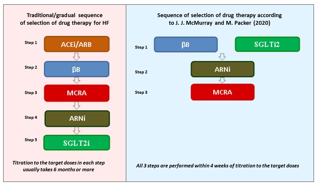 Fig. 3. The sequence of selection of drug therapy for HF according to J. J. McMurray and M. Packer (2020) in comparison with traditional therapy [28, 31]. Notes: ACEi — angiotensin converting enzyme inhibitor, ARB — angiotensin receptor blocker, βB — beta-blocker, MCRA — mineralocorticoid receptor antagonist, ARNi — angiotensin receptor-neprilysin inhibitor, SGLT2i — sodium-glucose co-transporter 2 inhibitor.
