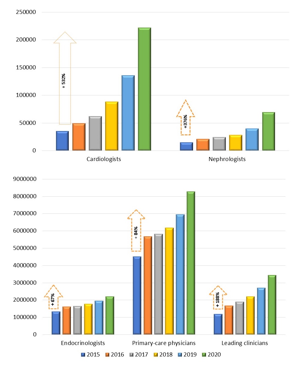 It is not surprising that in recent years the range of absolute indications for this group have considerably increased, not only and not so much in endocrinological practice, which would be expected, but also in cardiologic practice and, which is especially demonstrative, by primary healthcare (Figure 4) [33]. Nevertheless, to date, heart failure remains one of the “least satisfied needs in the treatment of cardiovascular diseases” due to its widespread prevalence, unfavorable prognosis and insufficient use of treatment methods with clinically proven effectiveness.