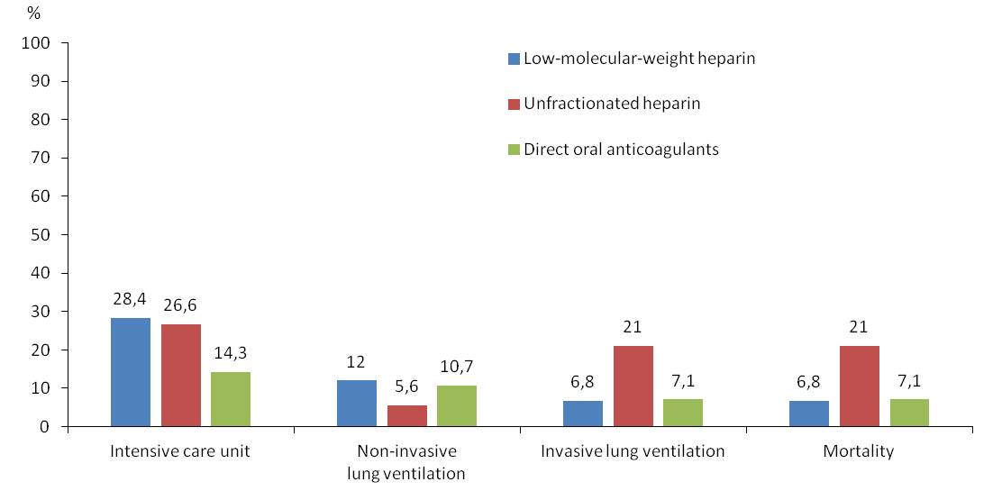 One of the main components of treatment of new coronavirus infection (NCI; syn.: infection induced by new coronavirus SARS-CoV-2, COVID-19) is anticoagulant therapy (ACT) which has proven effective in treatment and prevention of thrombotic complications [1–3]. The choice of an anticoagulant is an important issue since it is necessary to take into account not only the usual anamnestic data: concomitant pathology, patient’s weight, risk factors for thrombotic complications, but also new pathophysiological processes in NCI [4, 5]. The customary Virchow triad is supplemented with a ‘cytokine storm’, macrophage activation syndrome, endothelial dysfunction [6, 7]. In management of patients with NCI, not only coagulogram parameters are evaluated, but also inflammation markers that previously were not routinely considered in ACT [8, 9]. The temporary methodical recommendations of the Ministry of Health of the Russian Federation ‘Prevention, Diagnostics and Treatment of NCI’ classify variants of ACT to low-molecular-weight heparins (LMWH), unfractionated heparin (UFH) and direct oral anticoagulants (DOACs) [6]. The question of choice of the optimal anticoagulant in patients with NCI remains debatable. Thus, consideration of different variants of ACT in patients with NCI is an important question for optimization of effectiveness and safety of complex treatment.