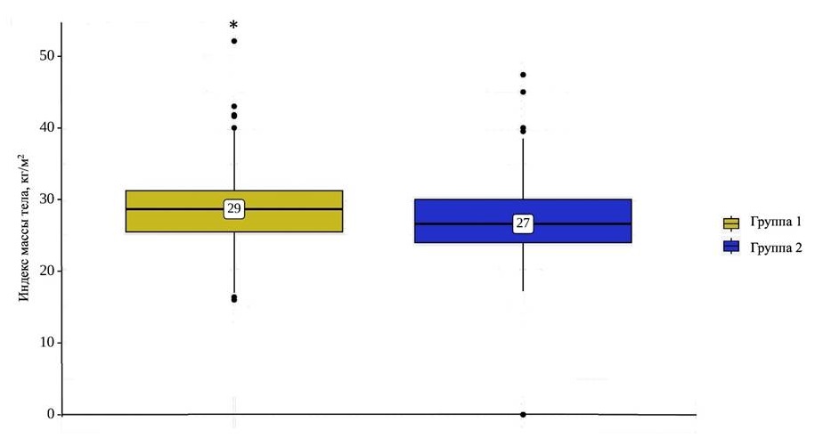 2. Fig. 1. Body mass index (Me (Q1–Q3)) in groups 1 (sudden death) and 2 (comparison group).