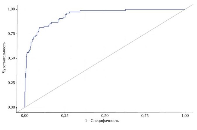 Fig. 3. ROC curve characterizing the dependence of the probability of the ‘patient alive-the patient died’ parameter on the value of logistic function P.