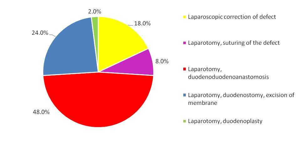 A special mention should be made of a significant number of congenital malformations of the duodenum (atresia, annular duodenum), running with threat of perforation. Treatment of these conditions is performed with increasing use of laparotomy (duodenotomy and excision of the membrane, duodenoduodenoanastomosis, longitudinal duodenotomy through the zone of stenosis) because of wide prevalence of this nosology and insufficient number of specialized neonatal surgery centers equipped and staffed with high-quality specialists, which could permit to increase the number of surgical interventions performed by laparoscopy [21].