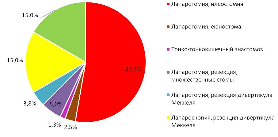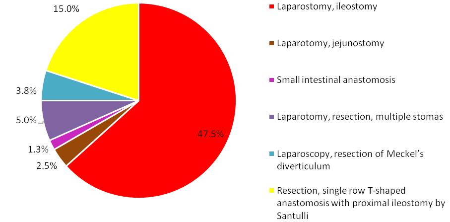 Another dangerous complication of a fairly common malformation of the intestinal tube (Meckel’s diverticulum, MD), is its perforation [37]. R. S. Shilo, et al. report the conduction of laparotomy in such cases with excision of the diverticulum with suturing of its basis with machine stitches and interrupted seromuscular sutures above the second row; another variant of surgical treatment is mobilization of the small intestine with resection of a perforated part with subsequent enteroenteral side-to-side anastomosis [38]. On the contrary A. Yu. Kozlov describes the possibilities for using minimally invasive interventions in MD perforations (video-assisted or laparoscopic resection with intracorporeal hand ties or machine stitches) [39, 40]. Thus, in perforations of the small intestine (SIP, MD), the prevailing surgical interventions are operations with a traditional open method (Figure 3).
