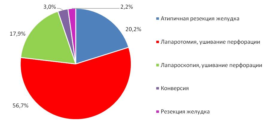 According to the results of the analysis of summarized data (Figure 1), the most widespread treatment method (56%) in modern clinical practice is transverse right-sided laparotomy and suturing of the defect of the stomach wall. Besides, there is a frequent use of such methods as atypical resection (20.15%) and laparoscopic suturing of perforation (17,9%). A small number of laparoscopic manipulations, in our opinion, may be associated with traditional views of the colleges toward this problem and approaches to its salvation (adherence to ‘open’ interventions), poor provision of the clinic with equipment, absence of the required skill.