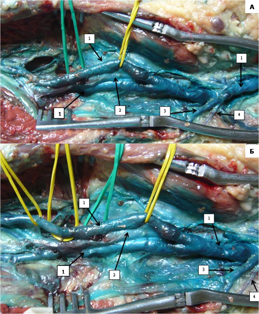 As control, the data of anatomical preparation of 50 amputated lower extremities of patients with obliterating atherosclerosis of arteries of the lower extremities without pathology of the venous system were taken, with preliminary filling the venous system with a blue synthetic gel.