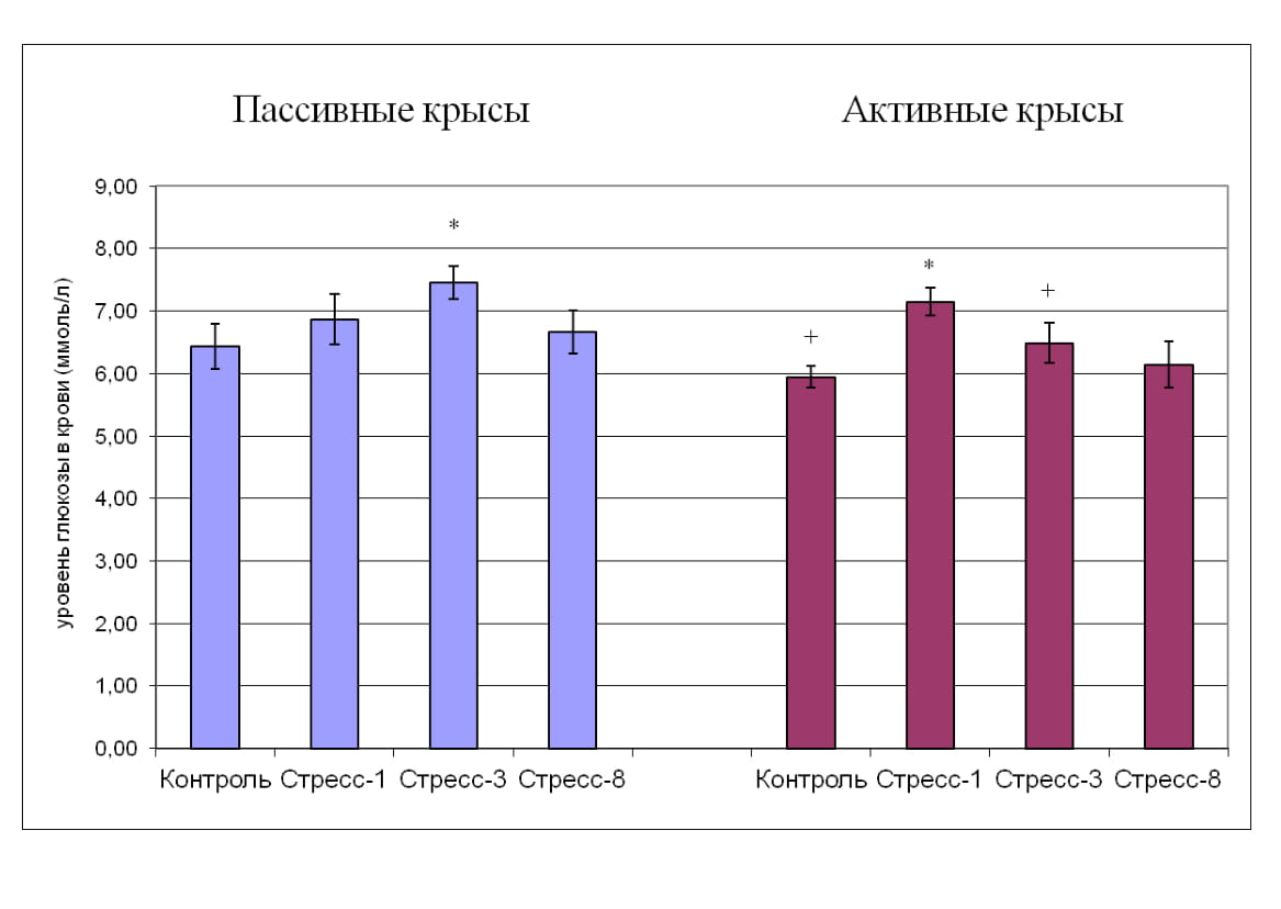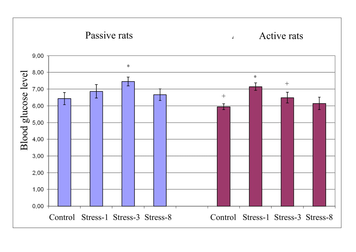 Results. The basal level of glucose in behaviorally active (stress-resistant) rats was lower than in passive (stress-predisposed) specimens. Repeated exposure of rats to stress resulted in development of hyperglycemia. However, the dynamics of blood glucose concentration was different in specimens with different parameters of behavior. The increase in glucose concentration in active animals was most pronounced after a single exposure. By the 3rd and 8th days of stress exposures, glucose level in these rats progressively decreased (as compared to the 1st day), but remained above the basal level. Passive specimens were characterized by the increase in blood glucose concentration after a single and, particularly, after three-time restraint stress. Glucose content in these animals slightly decreased by the 8th day (as compared to the previous periods), but was above the basal level.