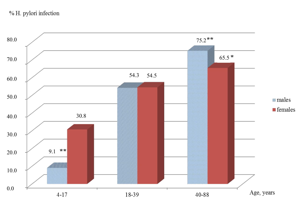 In individuals above 40 the incidence rate of helicobacteriosis was higher in males – 75.2%, and 65.5% in females (p<0.05). In young males and females under 40 years the incidence of infection did not show any reliable difference and was 54.3 and 54.5%, respectively (p>0.05).