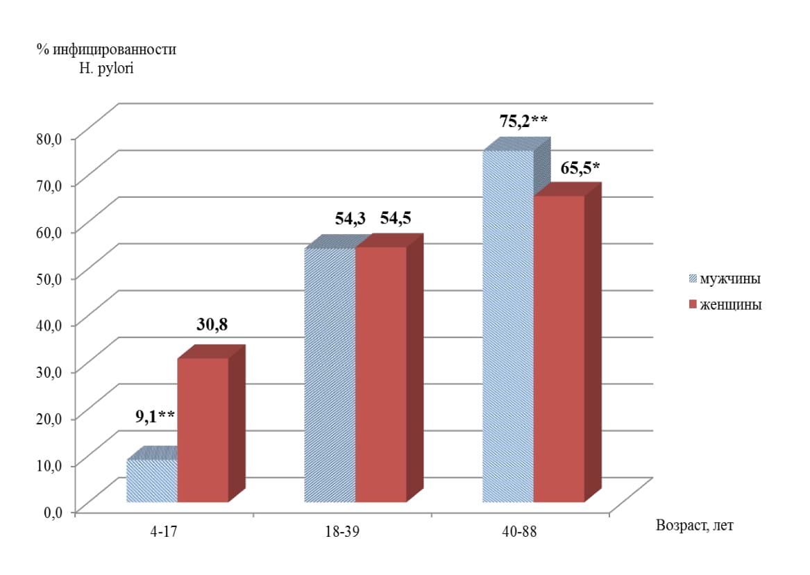 Conclusion. The data obtained indicate a high level of infection with H. pylori in the adult population in the Ryazan region – 65.6%. The incidence of detection of anti-H. pylori IgG in the population was maximal in individuals ≥40 years (67.2%).