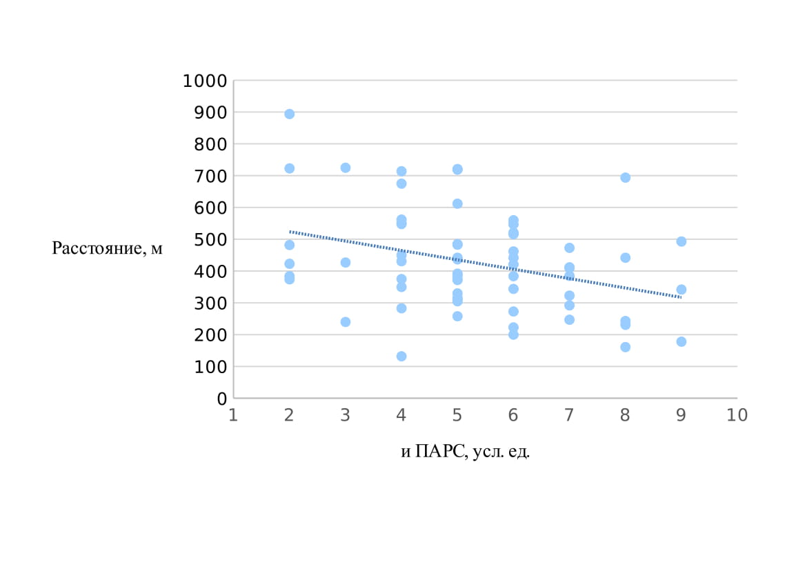 Индекс ПАРС имеет умеренную отрицательную корреляцию с пройденным расстоянием при тесте с 6-минутной ходьбой (R=-0,34, p<0,01, рис. 1). Другими словами, максимальный индекс ПАРС 6,23±1,8 усл.ед. получен у пациентов с минимально пройденным расстоянием за время 6-минутного шагового теста – 227,77±48,13 м; минимальный индекс ПАРС 4,36±1,7 усл.ед. получен у пациентов с максимально пройденным расстоянием – 690,82±92,69 м.