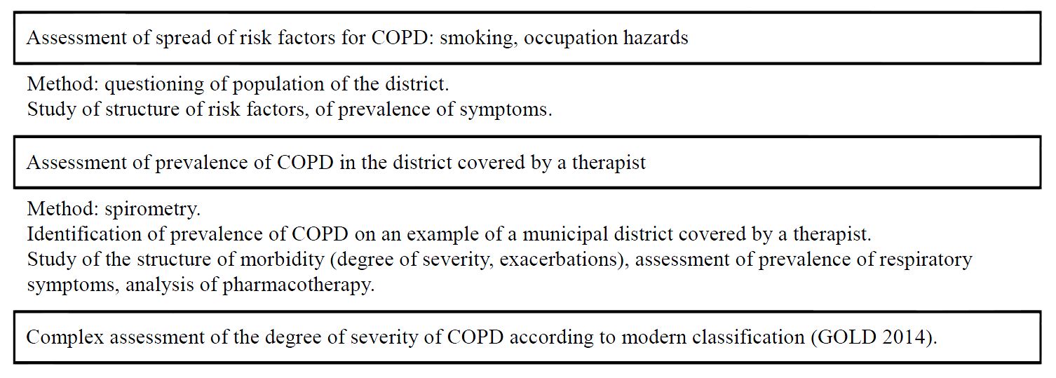 The work was conducted at the premises of municipal polyclinics №12 of Ryazan (total adult population 7 177 people) from October 2012 to December 2014. At the moment of start of research 19 patients with COPD were registered in the polyclinic.