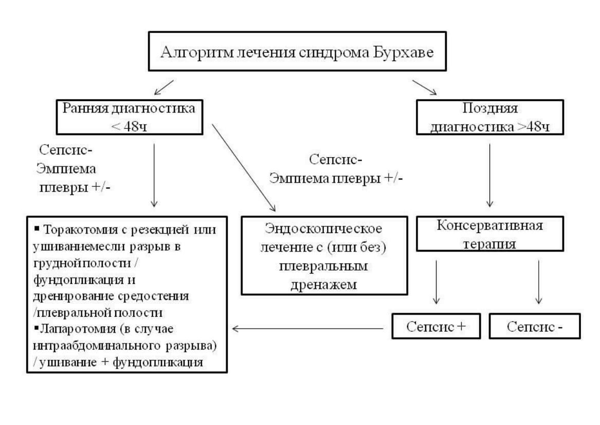 Таким образом, успешность лечения синдрома Бурхаве определяется ранней диагностикой, своевременной госпитализацией в специализированный стационар и проведением адекватного оперативного вмешательства.