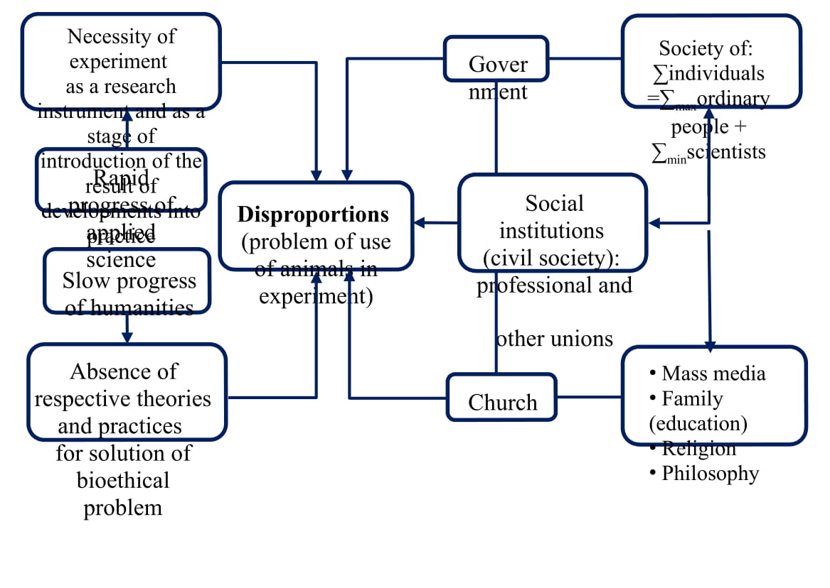 Both an ordinary person and a scientist being an individual, are under the influence of mass media, the family, religious and philosophical trends. At the same time the science as a phenomenon associated with gaining new knowledge is realized within the given society. Here, the applied sciences which products are demanded by the society, develop very rapidly, and this conditions the use of an experiment as a scientific instrument and as a stage of introduction of achievements into practice. But a slow progress of humanities results in the absence of adequate theories and practices of solving the conflict (a bioethical problem). A rapid development of products and technologies on the one hand and the absence of instruments for solution to the conflict on the other hand creates disproportions and contradictions in use of animals in experiment. Taking this into account, the only mechanism of solution is use of regulatory measures – a task that must be set before governmental agencies, public institutions, professional unions (regulatory legal acts that regulate in vivo experimental research will be discussed in Part II of the given work).