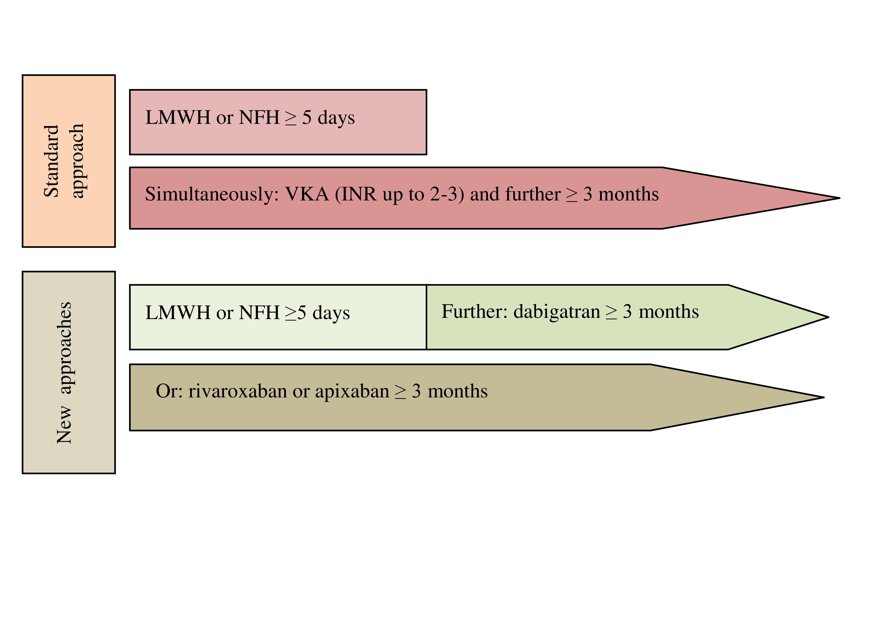 A standard approach (Fig. 1) suggests simultaneous application of vitamin K antagonist (VKA) – warfarin – and NFH/LMWH (within minimum 5 days). After reaching the target values (2.0-3.0) for the international normalized ratio (INR) within the two subsequent days, transition to VKA monotherapy is made [1]. A standard starting dose of warfarin is 5 mg, further the dose is selected under control of INR according to the common algorithm, the process may be simplified and accelerated by pharmacokinetic testing [11]