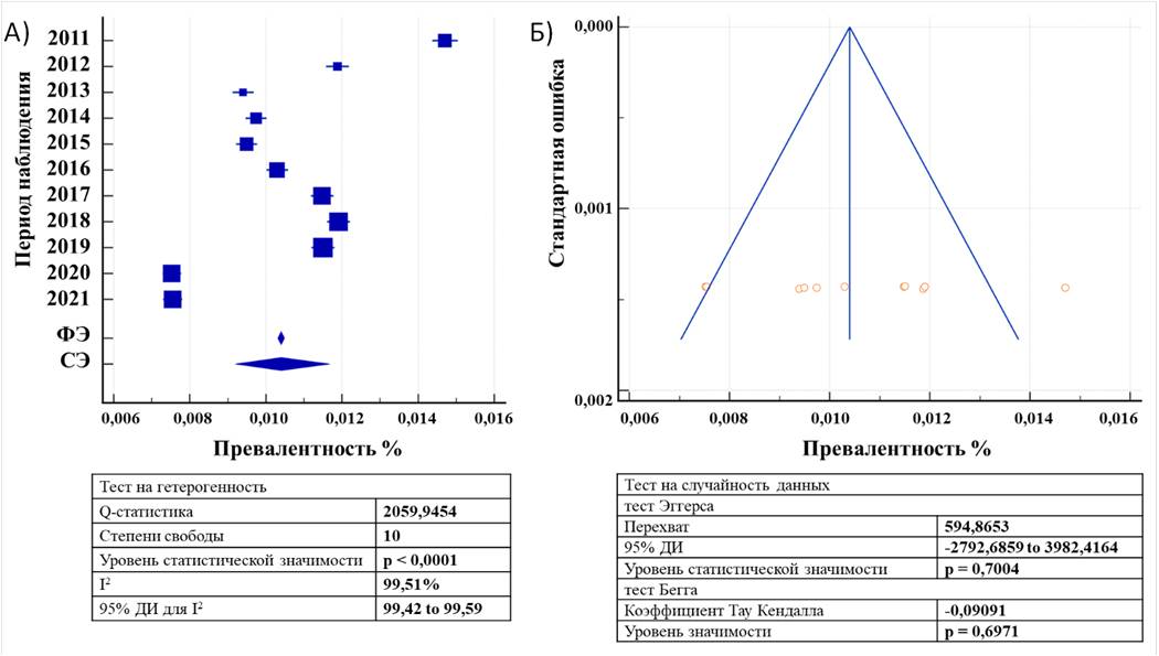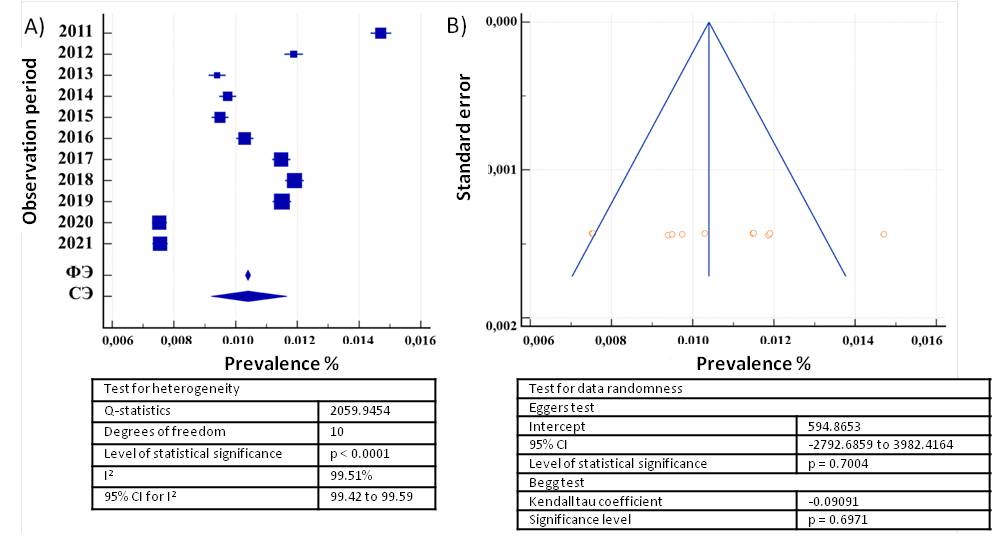 Fig. 4. Forest plot (А) and funnel plot (B) of parameters of the groups included in the study in 2012–2022. Notes: RE — Random Effect, FE — Fixed Effect