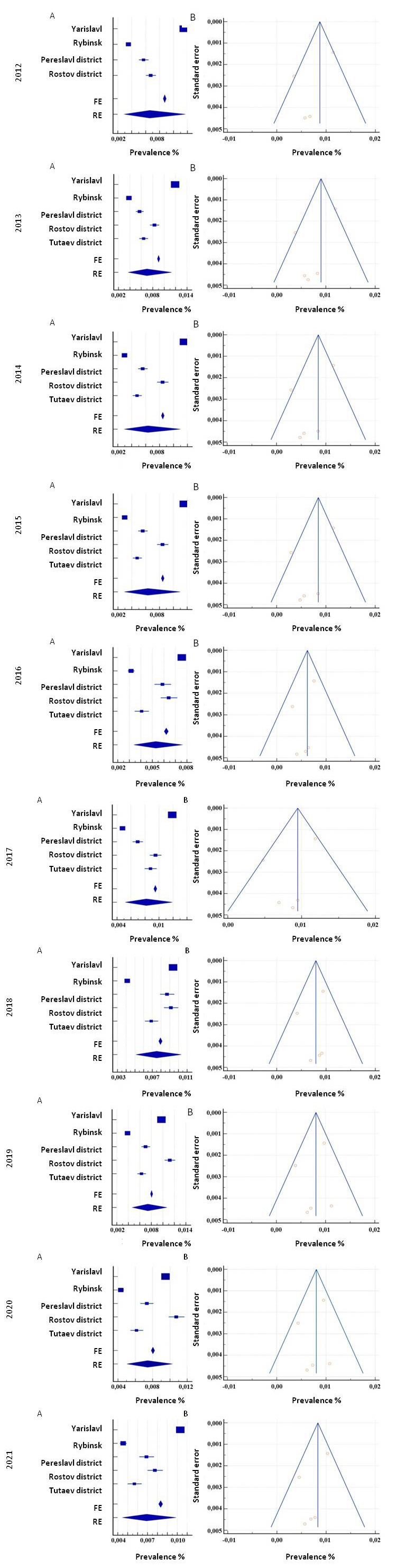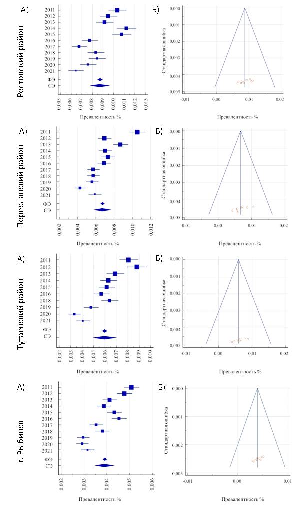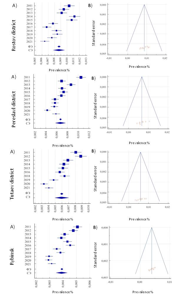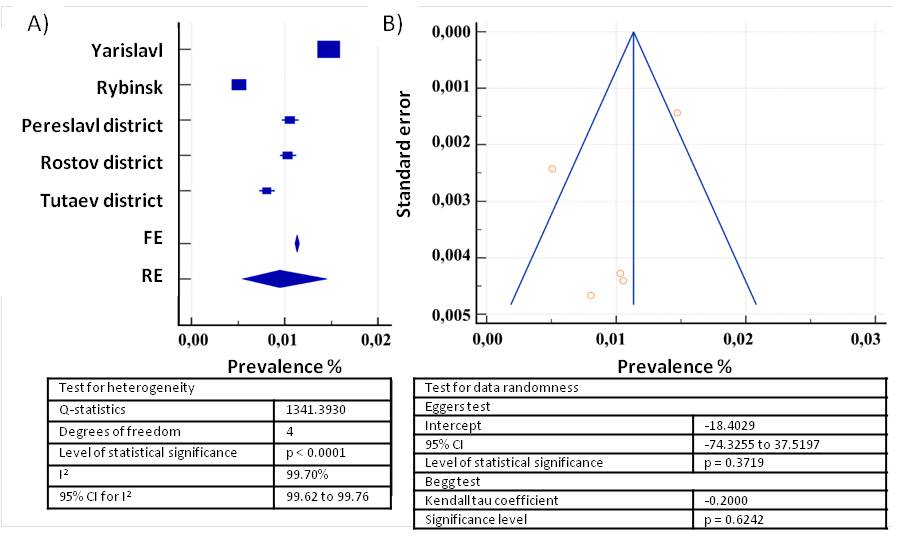 Fig. 2. Forest plot (A) and funnel plot (B) of parameters for groups included in the study, according to the data of state medical organizations of Rostov, Pereslavl, Tutaev districts and of the city of Rybinsk. Notes: RE — random effect, FE — fixed effect
