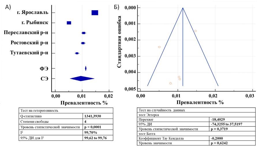 Fig. 1. Forest plot (А) and funnel plot (B) of parameters of groups included in the study, on the basis of the data of the state medical organizations of Yaroslavl. Notes: CI — confidence interval, RE — random effect, FE — fixed effect.