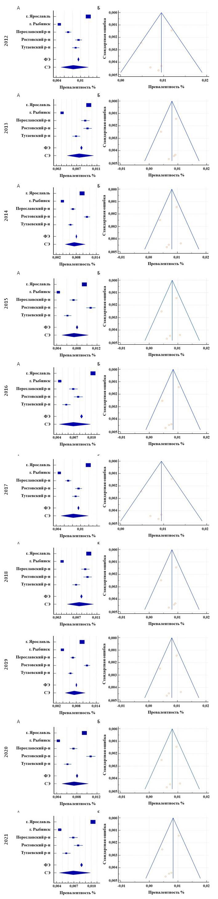 In analysis of the data for 2011–2021, a trend is determined to reduction of the incidence of LEVV. At the end of 2021, the prevalence of LEVV in Yaroslavl decreased by 0.715%, in Pereslavl district — by 0.466%, in Tutaevsky district — by 0.4%, in Rostov district — by 0.392%, in Rybinsk — by 0.192% with high heterogeneity (I2 99.14; 95% CI: 98.81–99.39; Table 4).