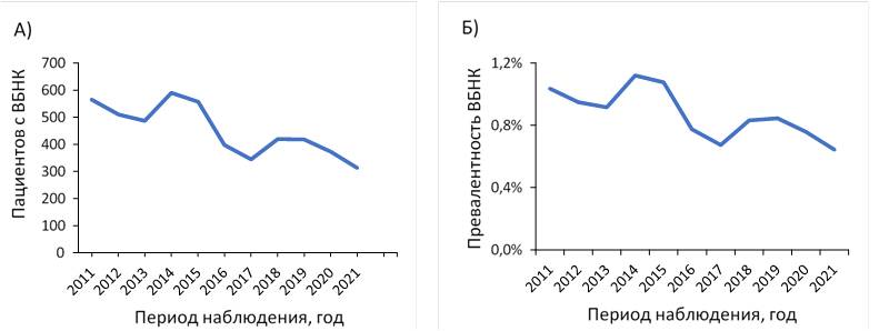 The assessment of absolute and relative values of LEVV among the adult population in Rostov region in 2011–2021 is presented as a plot resembling a declining sinusoid. Here, the incidence of LEVV per capita of the dult population for the same period of time shows stronger fluctuations (Figure 5). The lowest prevalence parameters were noted in 2013, 2017 and 2021. Peaks of LEVV incidence occurred in 3 periods: 2011, 2014–2015 and 2018–2019.