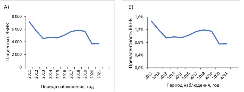 Fig. 6. Number of patients with А) and prevalence (B) of LEVV in Yaroslavl from 2011 to 2021. Notes: LEVV — lower extremity varicose disease.