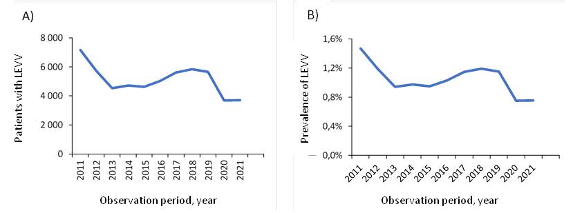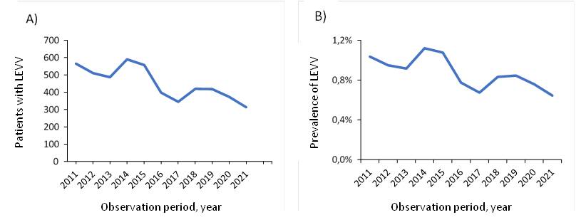 The dynamics of absolute and relative values of LEVV among the adult population of Yaroslavl for 2011–2021, presented in the form of a plot, also resembles a sinusoid with a downward trend. At the same time, the frequency of occurrence of LEVV per capita of the adult population for the same period of time has a more flat form (Figure 6). The lowest prevalence rates of LEVV were noted in 2013, 2015 and 2020, 2021. Peak incidence of LEVV occurred in 2 periods: 2011, 2018–2019.
