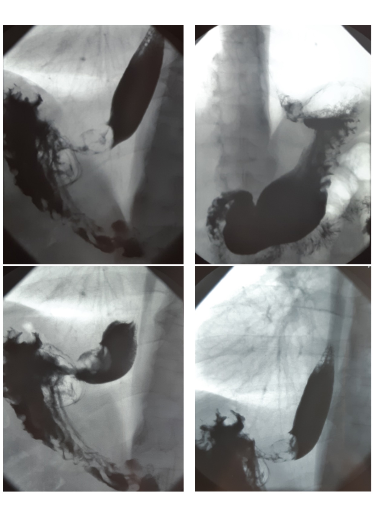 Endoscopic and X-ray examinations (Figure 3) revealed cicatrical stenosis in the zone of gastroanastomose. After per os intake of barium suspension, narrowing of the lumen to 0.4 cm along 0.7 cm length was determined in the region of anastomose in a series of X-ray pictures. Evacuation through the esophagus, transplant, a part of stomach in the abdominal cavity and duodenum was visible.