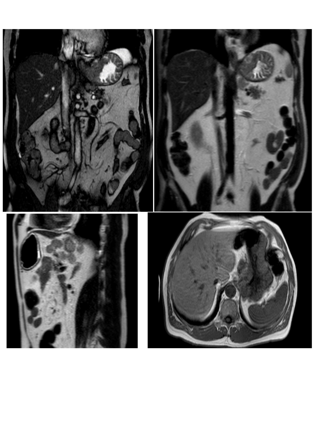 Fig. 2. Results of MRT of the abdominal cavity: Thickening of the gastric wall in the zone of the cardial part (attributable to the neoplastic process with infiltrative growth); near the stomach along the right contour enlarged lymph nodes are determined (right cardiodiaphragmal, of lesser curvature, of the left gastric artery) up to 25x17 mm in size. Conclusion: a picture of voluminous formation in the cardial part of the stomach, regional lymphadenopathy (of metastatic character)