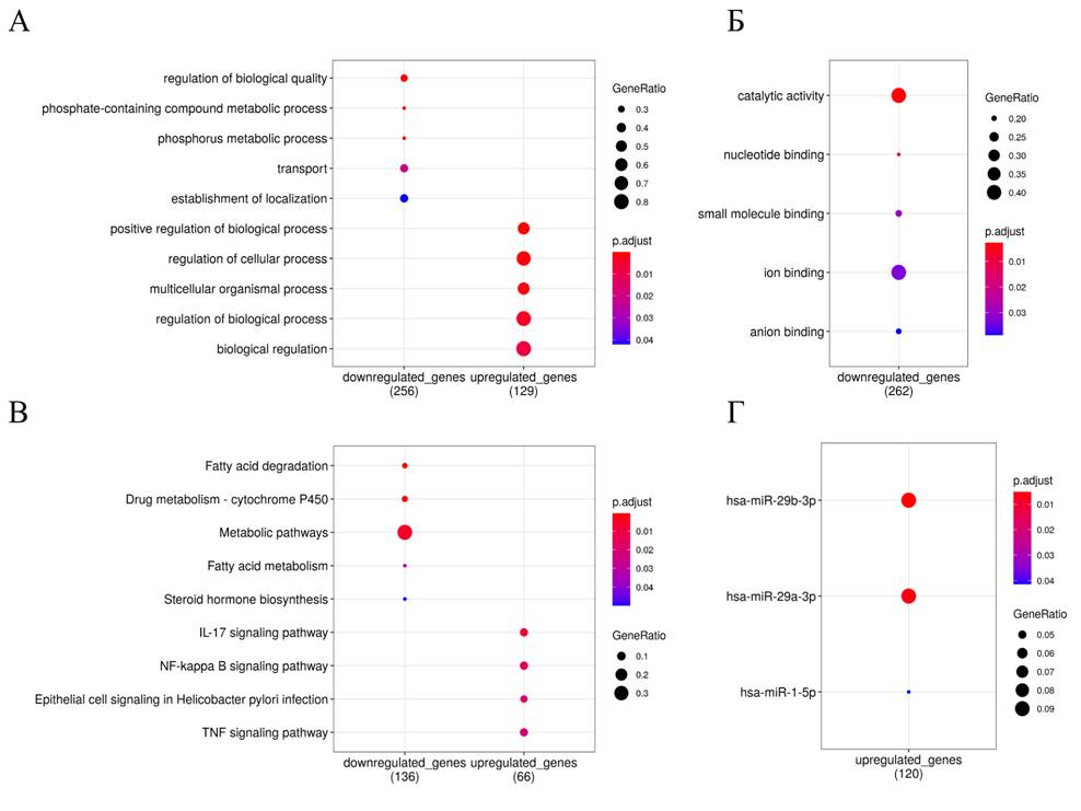 These biological, molecular processes, as well as signaling pathways play an important role in the regulation, transport, adhesion of molecules, in catalytic activity, drug metabolism, biosynthesis, degradation and metabolism of fatty acids. We have obtained the data on the ‘NF-kappa B’, ‘TNF’ signaling pathways and on the regulation of different miRNAs.