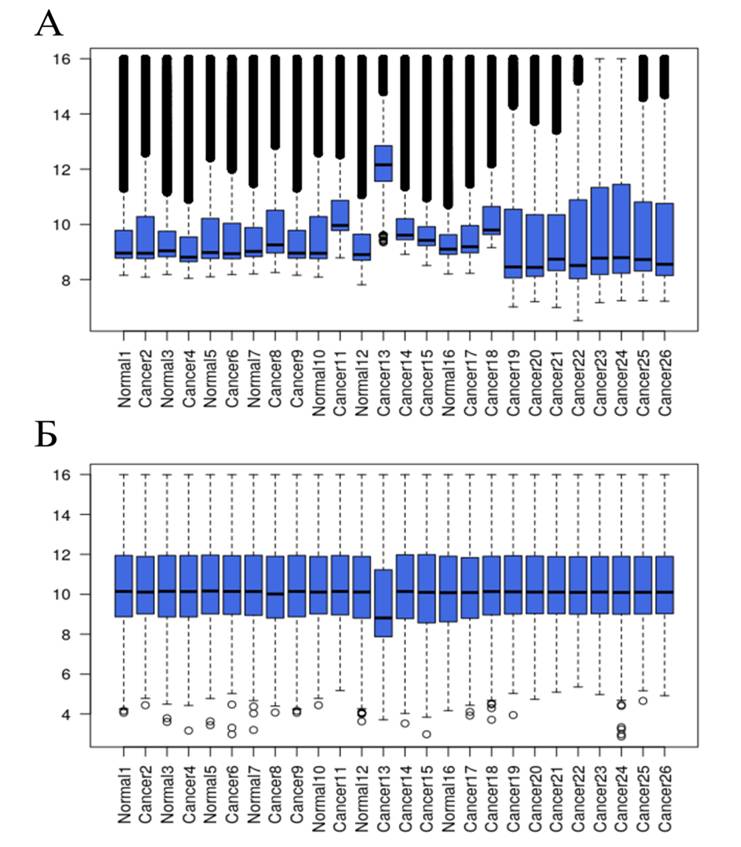 After the import of the raw data obtained from expression chips, the check was performed for the difference between samples, and normalization of the input data. Normalization of the data was followed by noise correction, after which the data were cleared of bad and technical microchip probes. As can be seen in Figure 1, the data required additional normalization and subsequent filtration.