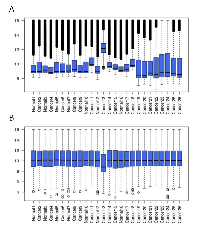 Fig. 1. Box plots for raw data (A) obtained from expression chips and data (B) obtained after filtration and normalization.