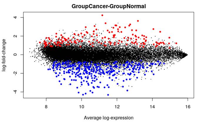 Note: Red and blue dots show enhanced and reduced expression of genes in the tumor material of the patients.