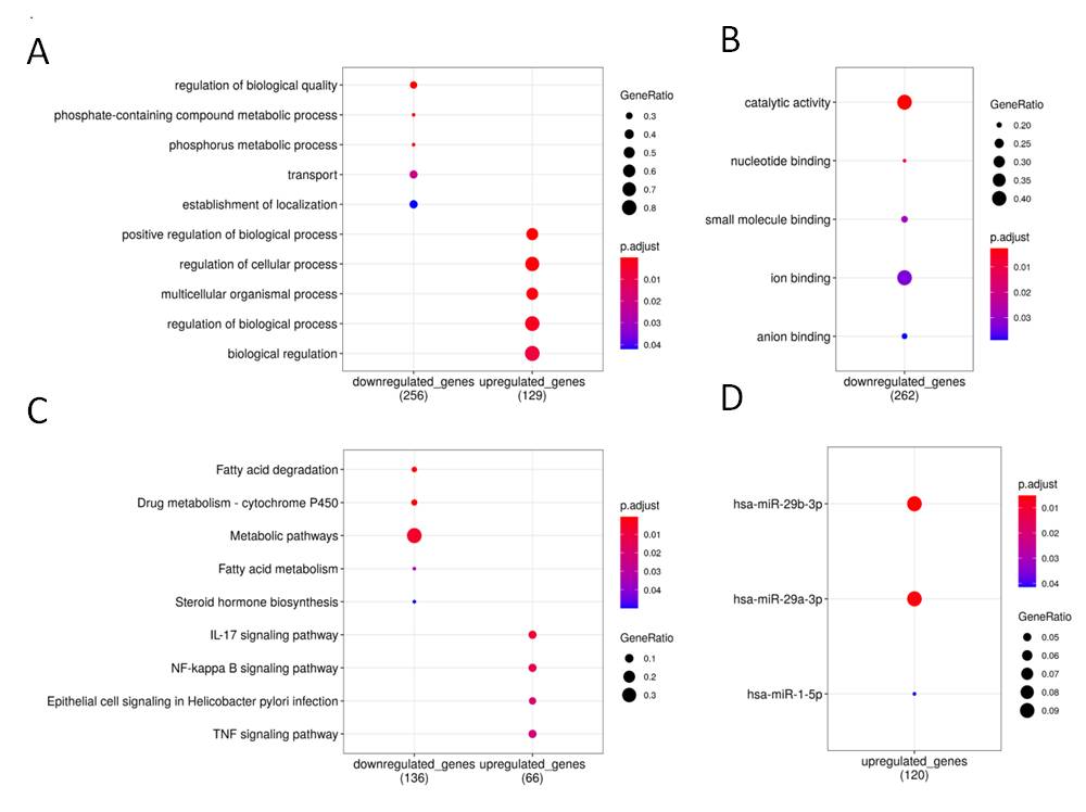 Fig. 3. Analysis of biological processes (A), molecular functions (B), signaling pathways (C) and miRNA (D) for the groups with increased and decreased expression of genes. On X axis — expression groups, on Y axis — different processes and signaling pathways changed in increased and decreased expression of genes.