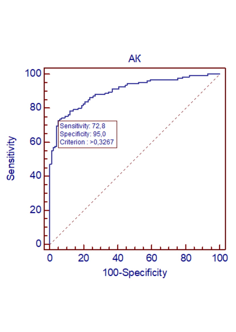 Results of ROC-analysis are given in Figure 1. The statistically significant level was p≤0.0001. The surface area below ROC-curve was 0.902; standard error – 0.0199; percentage of correctly classified cases – 72.8% (indicated confirmation of MN of FSS in 73 cases).