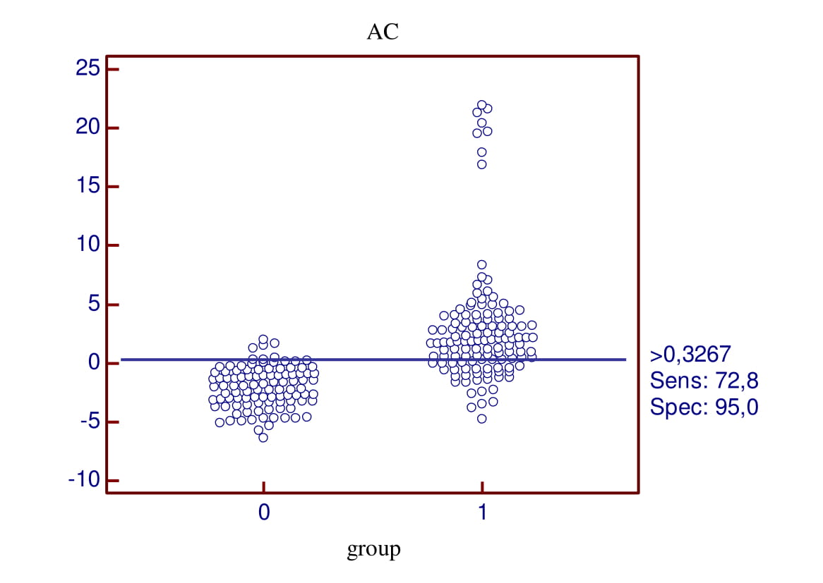 Note: surface area under ROC-curve was 0.902; AC – associated, or prognostic coefficient