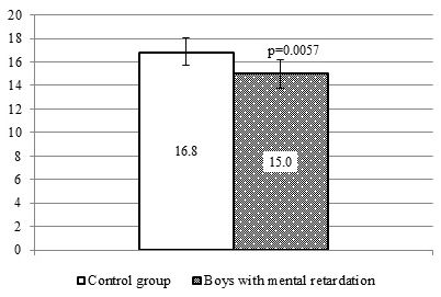 We also examined Quetelet II index that characterizes the proportion between body mass and body length. In boys with mental retardation decreased Quetelet II index was recorded in comparison with the control group (р=0.0057, Figure 1).