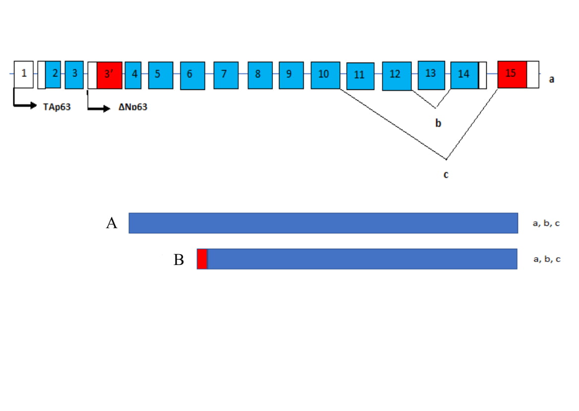 Fig. 2. Scheme of ТР63 gene and of its proteins: Scheme of exons and respective domains of TP63 gene; B. Isoforms of р63 proteins [14, 11]