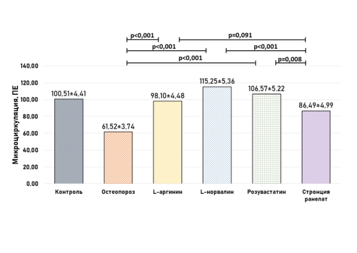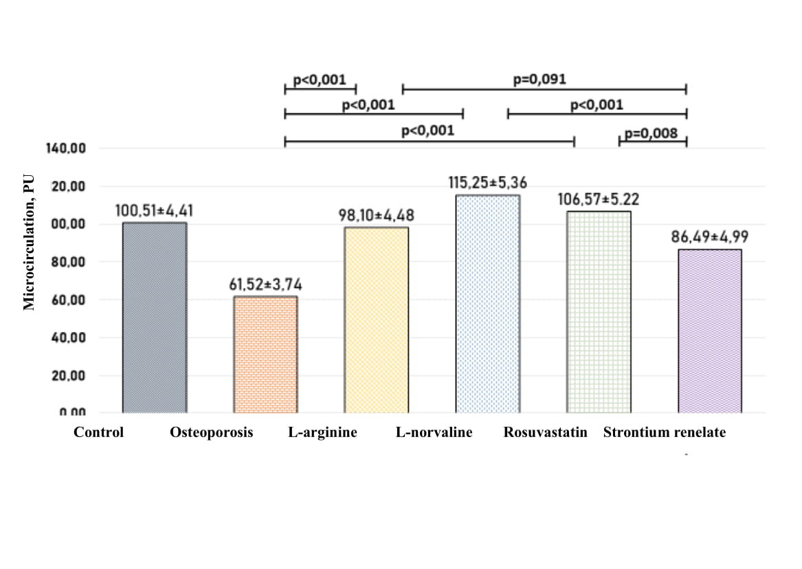 Results of LDF in the rats who received L-norvaline (n=20), were also higher than in the group of rats with osteoporosis without treatment (р<0.001) and of animals given strontium renelate (р<0.001), but did not show any statistically significant differences from the control group (p=0.051).